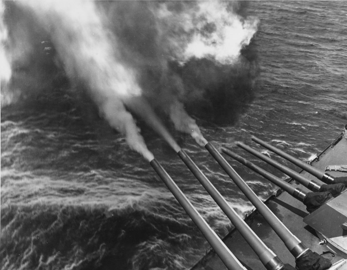 The remainder of the month was a mix of time spent in anchorage and at sea training, before the action resumed in mid-June with the invasion of the Marianas. Iowa was again supporting the carrier fleet, although she and the other fast battleships were detached to bombard Japanese positions on Saipan and Tinian on June 12th in preparation for the landings beginning on the 15th. Iowa blew up an ammunition dump, which was apparently rather spectacular, but the ships were forced to remain far enough offshore that the bombardment was described as "a Navy-sponsored farm project that simultaneously plows the fields, prunes the trees, harvests the crops, and adds iron to the soil."1
