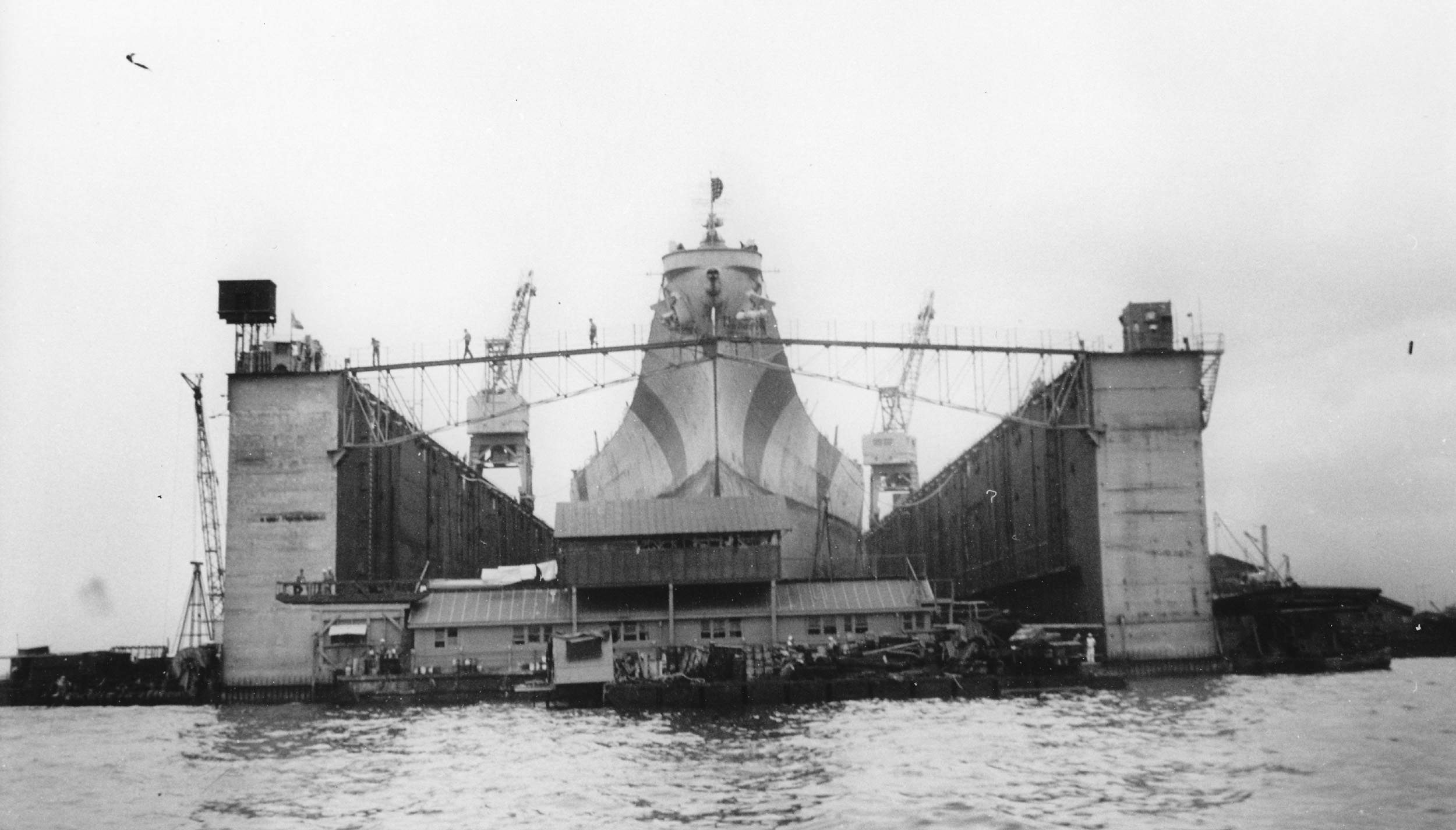 Iowa entering a floating drydock in Seadler Harbor, Admiralty Islands, Dec 27 1944