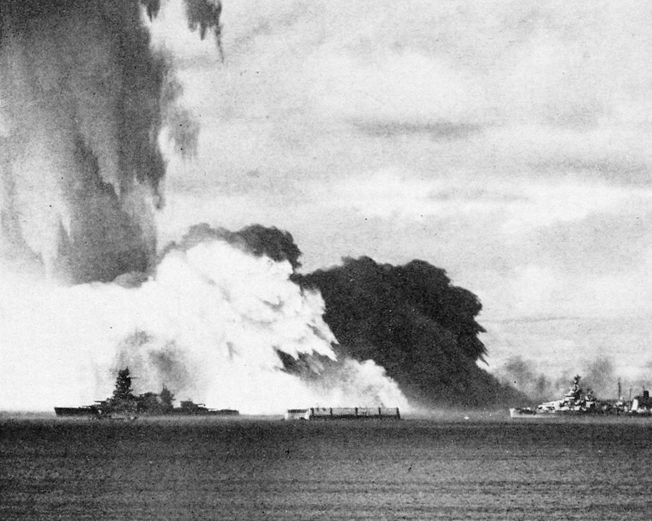 Nagato is visible in the lower left of this picture, taken moments after the detonation of the Crossroads Baker device