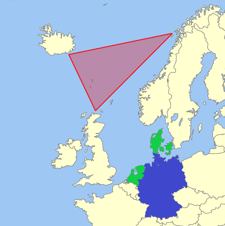 The patrol area (in red) with Germany in blue and neutral transshipment countries in green