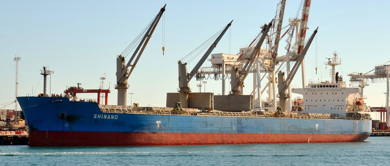 Bulk Carrier Shinano unloads one of her holds with her onboard cranes
