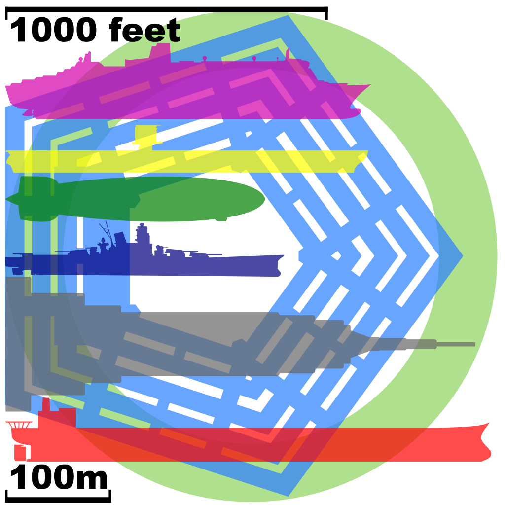 Seawise Giant (bottom) in comparison to other large objects
