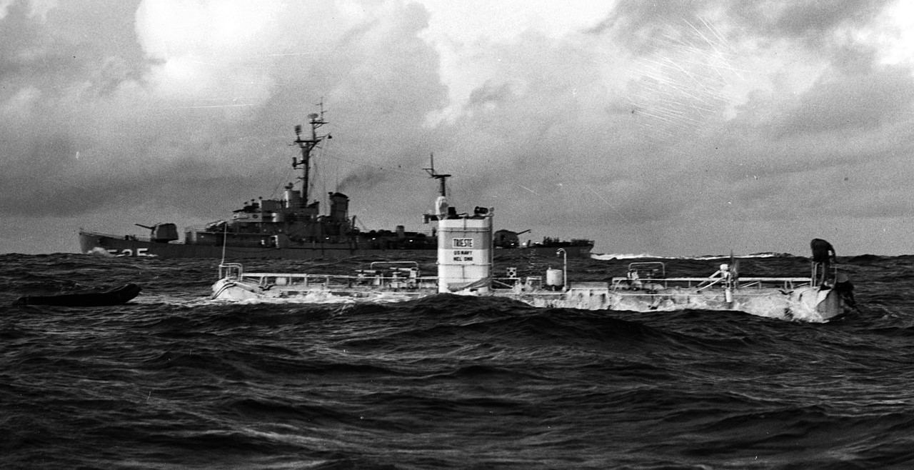 Bathyscape Trieste, preparing for the first dive on the Marianas Trench
