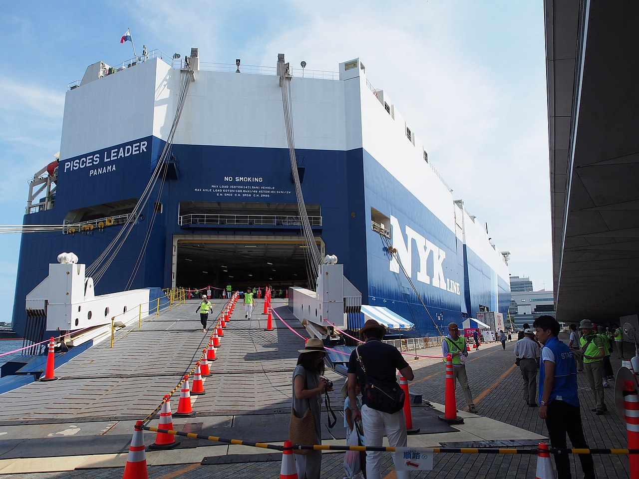 A much larger fleet are the car carriers. Cars are a low-density cargo,3 and most ships would have insufficient volume to carry them economically. The resulting vessels are extremely boxy, with intricate mazes of decks and ramps to allow cars and trucks to be driven off quickly and efficiently. In recent years, car carriers have branched out somewhat into medium-heavy cargo up to ~150 tons, with ships being fitted with suspended decks that can be lifted to increase the available height for things like locomotives and heavy turbines, or just to accommodate heavy trucks in place of cars. The largest vessels can transport over 8,000 cars at a time, which are delivered to the piers over side ramps.