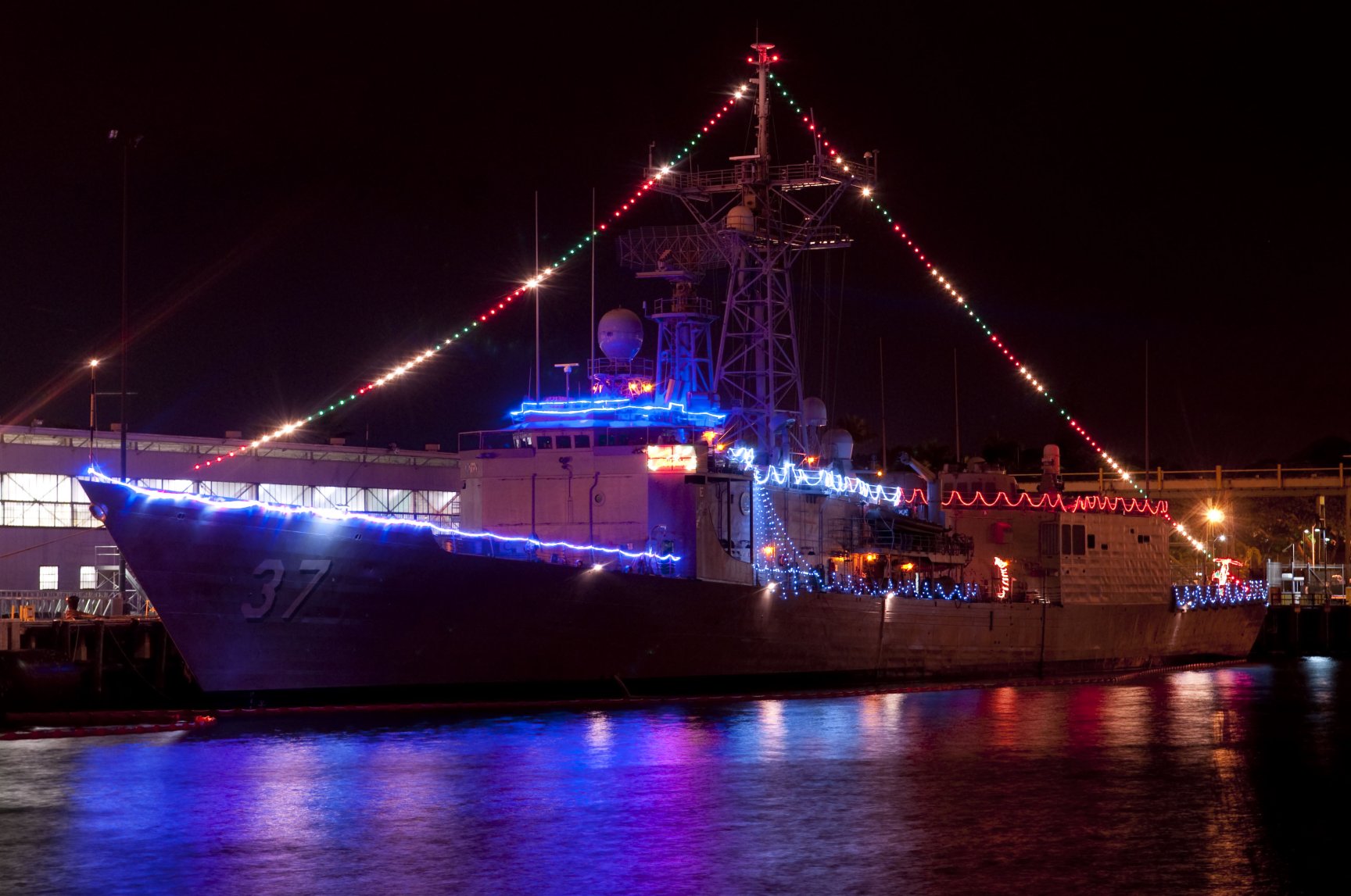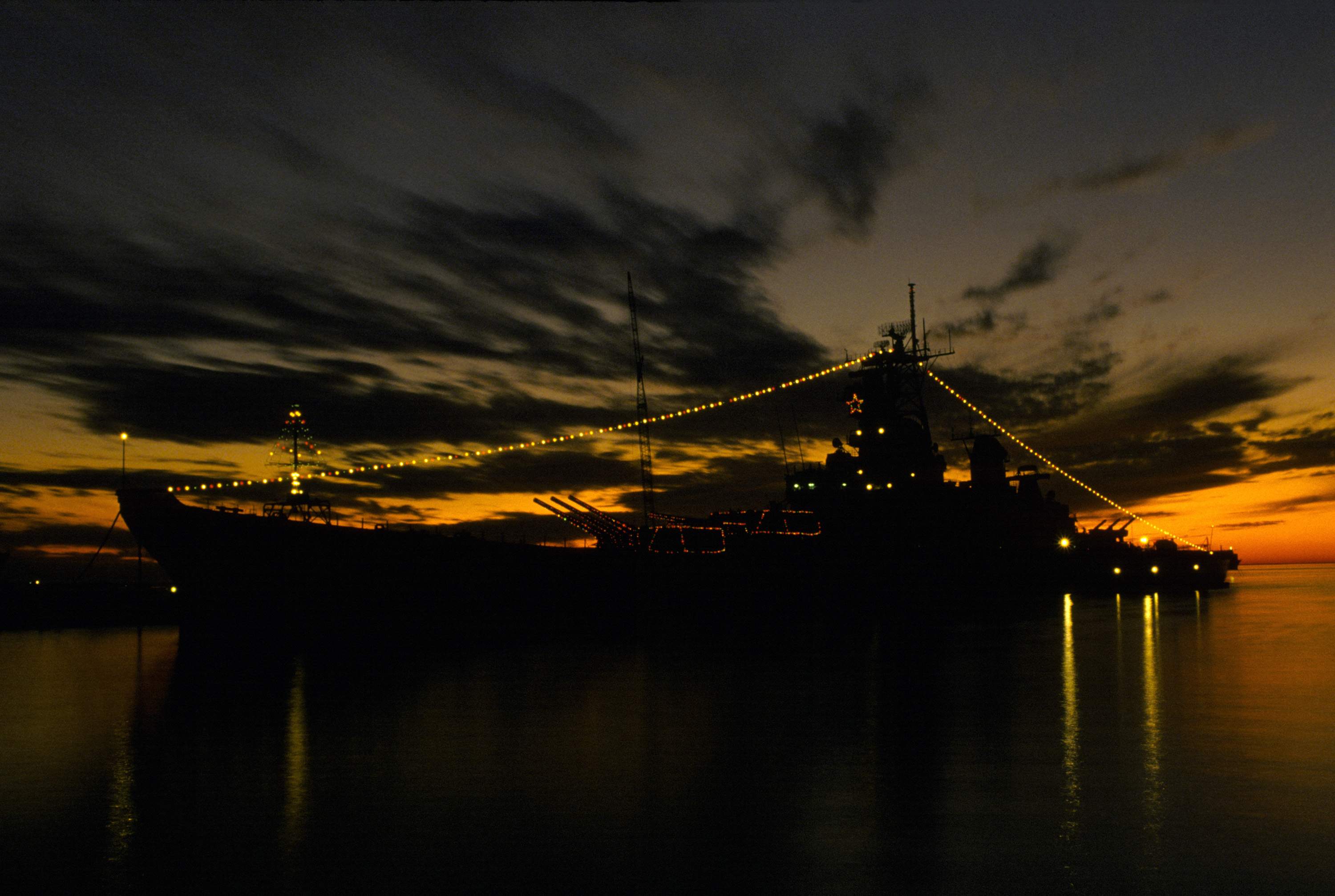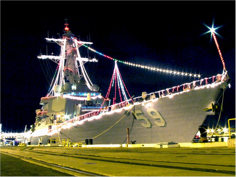 Merry Christmas, all. As I hope that you're spending time with your families, and I don't have any fun naval Christmas traditions to talk about, please accept some pictures of warships decked out in Christmas lights.