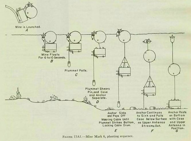 Another important innovation was the automatic depth setter. Contact mines need to be deep enough to be concealed while being shallow enough that ships can’t pass over them. Early on, moored mines had their cables cut manually to achieve this, but this was time-consuming, and the automatic depth setter was soon invented to solve this problem. A mine would have three separate parts, the mine proper, the anchor (a box), and the plummet. Initially, the mine and the anchor would float together, while the plummet fell, attached to the anchor by a length of cable equal to the desired mine depth below the surface. When the plummet reached the end of its cable, it pulled a pin which allowed water to flood the anchor and start it sinking. The mine’s chain was then played out from the anchor as it fell. When the plummet reached the bottom, the release of its weight locked the chain and the mine was dragged down to the desired depth by the anchor.