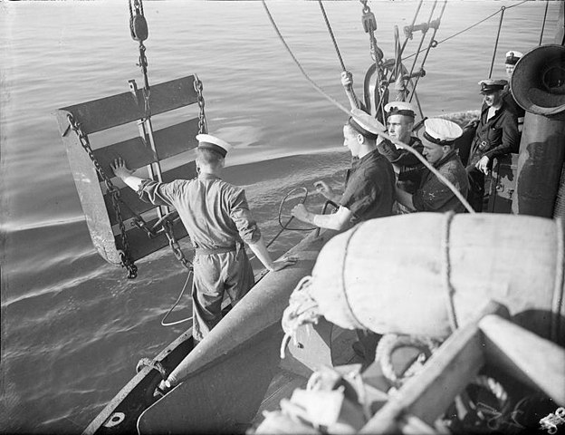 The other side of using mines is mine countermeasures, most notably sweeping. Sweeping for mines is exactly what it sounds like. The standard method was to take a small vessel, originally a converted fishing trawler, and stream a pair of “sweeps” from it. These long wires are held out from the side of the ship by underwater gliders called kites which keep the cables under tension. The sweeps are designed to break the mooring cables of the mines, either through mechanical damage or small explosives, causing them to float to the surface where they are usually sunk by gunfire from the sweeper. The sweeps also serve a protective function. Mines are usually pushed aside by the bow wave, then drawn in to strike the side of the ship, but the sweeps prevent this from happening. Similar devices called paravanes are used by larger ships to protect them from mines, intended to push the mines aside instead of cutting their cables.