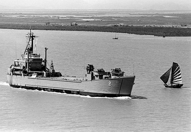 USS Washtenaw County being used as a mine bumper in Haiphong Harbor, 1973