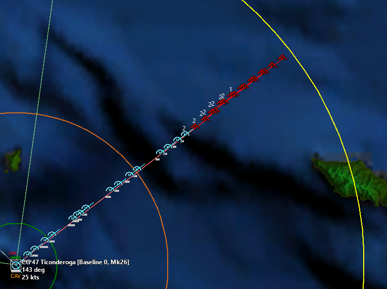 I then tested it with the 1991 NTU version of California. The big draw here is the wider spread between follow-up salvos, which should make NTU a lot more effective. The missiles are now RIM-66J SM-2MR Blk II. Engaged at 26 nm, Ph 0.54.