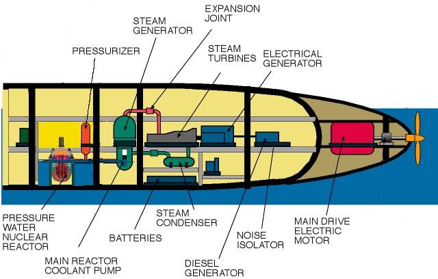 Other changes have been made to get rid of noise, the enemy of submarines. Early nuclear submarines were quite loud, with lots of noise from reactor pumps and gearing. Since the mid-60s, all nuclear boats have had their machinery mounted on noise-isolating rafts, which has helped the situation, but not solved it entirely. A nuclear submarine can't shut its reactor down completely while at sea6 so unlike a diesel boat, it will always make a bit of noise from the circulation of the coolant inside the reactor. Most reactors require pumps to aid this, although more recent submarine reactors are designed to operate at low power using natural circulation, based on the tendency of hot fluids to rise and cool ones to sink. The first submarine of this type, USS Narwhal, also had a direct-drive turbine to eliminate gear noise. She was said to spend more time on the coast of the Soviet Union than most of their navy. The Ohio class SSBNs also had natural-circulation reactors, and most modern SSNs have similar capabilities.