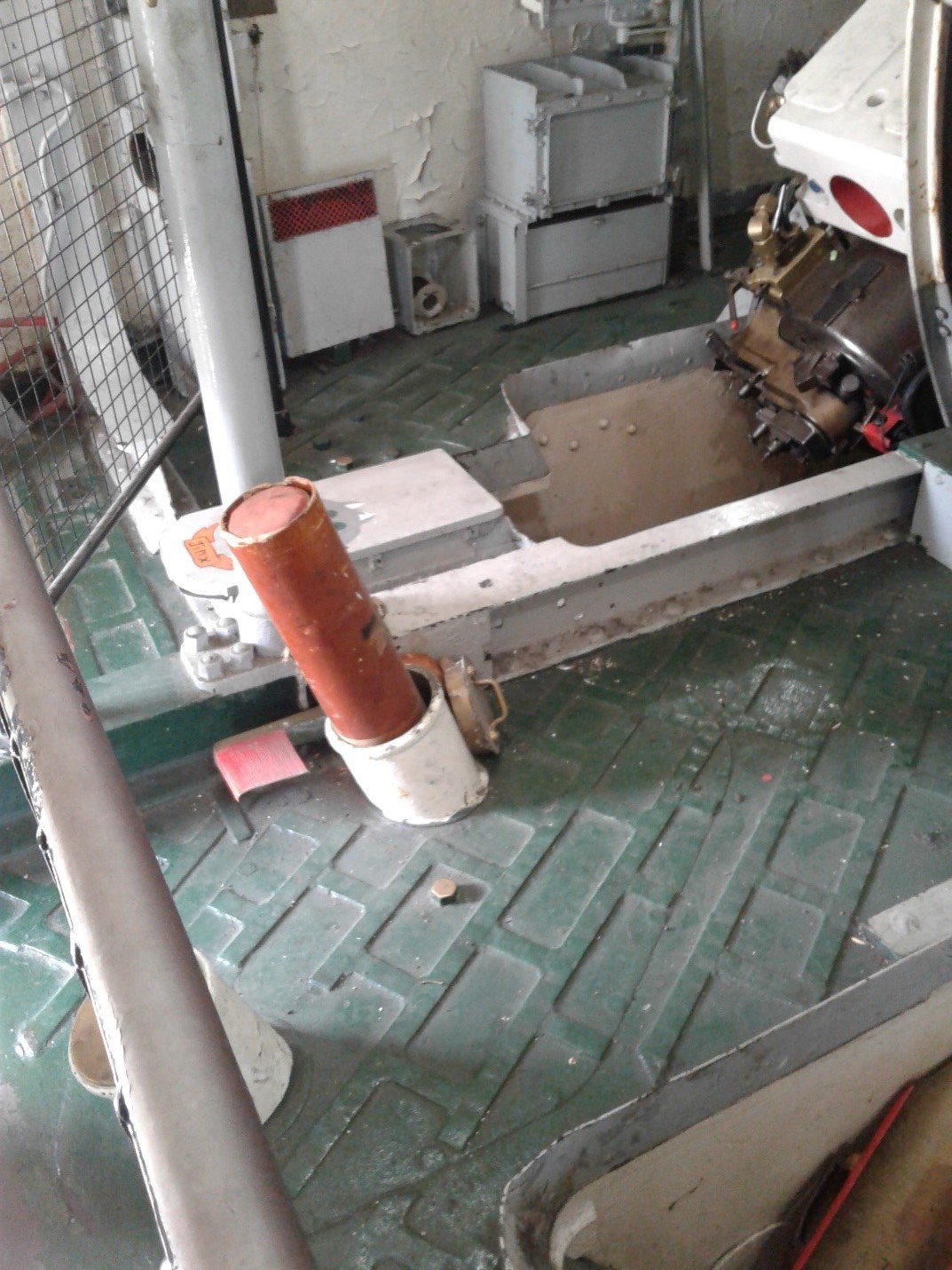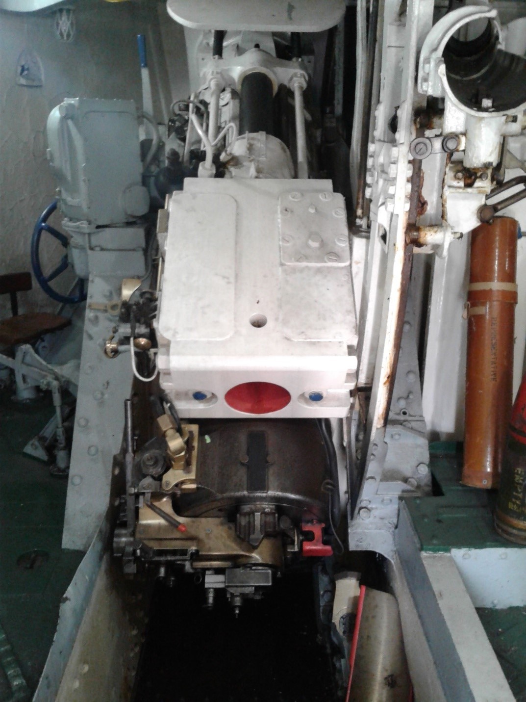 A feed tube for the propellant, brought up from the magazine below. These were light enough that they could be directly sent up, seemingly without a hoist. I suspect this kind of high-speed ammunition supply was necessary for the gun to be able to fire eight rounds a minute.