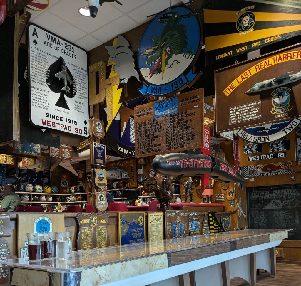 But they weren't. Signage was uniformly good throughout, and a lot of the planes were carefully staged to show off various aspects. It was also one of the more accessible air museums I've ever been to, with an opportunity to get up close and personal with the planes that most museums would keep you well away from. And they also had a lot of other displays on various aspects of naval aviation on the upper level, everything from aerospace medicine to airships to catapults and landing techniques to the Skylab 2 Command Module. But the single best part of the museum was the recreation of a bit of a WWII carrier, including a ready room, several offices, and a bit of berthing, which was absolutely spot-on. I have been on museum ships which were less convincing, and they even got the smell right. There's also a nice section of recreation hangar deck, a replica of a 1942 jungle airbase, and a section of home front shops from WWII, all lovingly detailed. Seriously, that section was amazing. There are also some other nice diorama sections, from a WWI airbase to the island of USS Cabot (CVL-28) to a cutaway PBY to Jesse L. Brown's crashed Corsair. There's also the officer's club from NAS Cubi Point, moved after the base closed in 1992 and now a restaurant. I'll let Neptunus Lex explain its significance, but even if you decide to eat somewhere else, you should at least take a walk through to marvel at all of the cruise plaques.