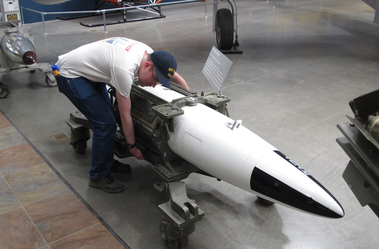 You enter the museum through the main hangar, which is a fairly decent air museum all by itself. Highlights include an SR-71, an F-14, an F-4 in Thunderbirds colors, an F-11 in Blue Angels livery, an F-107, a DASH drone and most importantly a B57 nuclear depth charge. There are a number of artifacts. Unless it is the dead of winter, you should ignore all of these for now and head straight for the outside park, because it's only going to get hotter throughout the day. This will dump you out in the middle of the section on land-based Cold War fighters, which has pretty much one of everything from that era, or two if there was a major change in type (for instance, straight-wing and swept wing F-84s). My only critique of this (and of the outside section more broadly) is that the layout often feels rather random. For instance, one row starts out with an A-7, then an F-100, an F-106, an F-102, an F-80, two F-84s and an F-16. This is fine if you're an aviation enthusiast on your own, but at this point, Cassander and I were trying to give an overview of jet fighter development to about 20 people, and it would have been much easier had it been chronological.