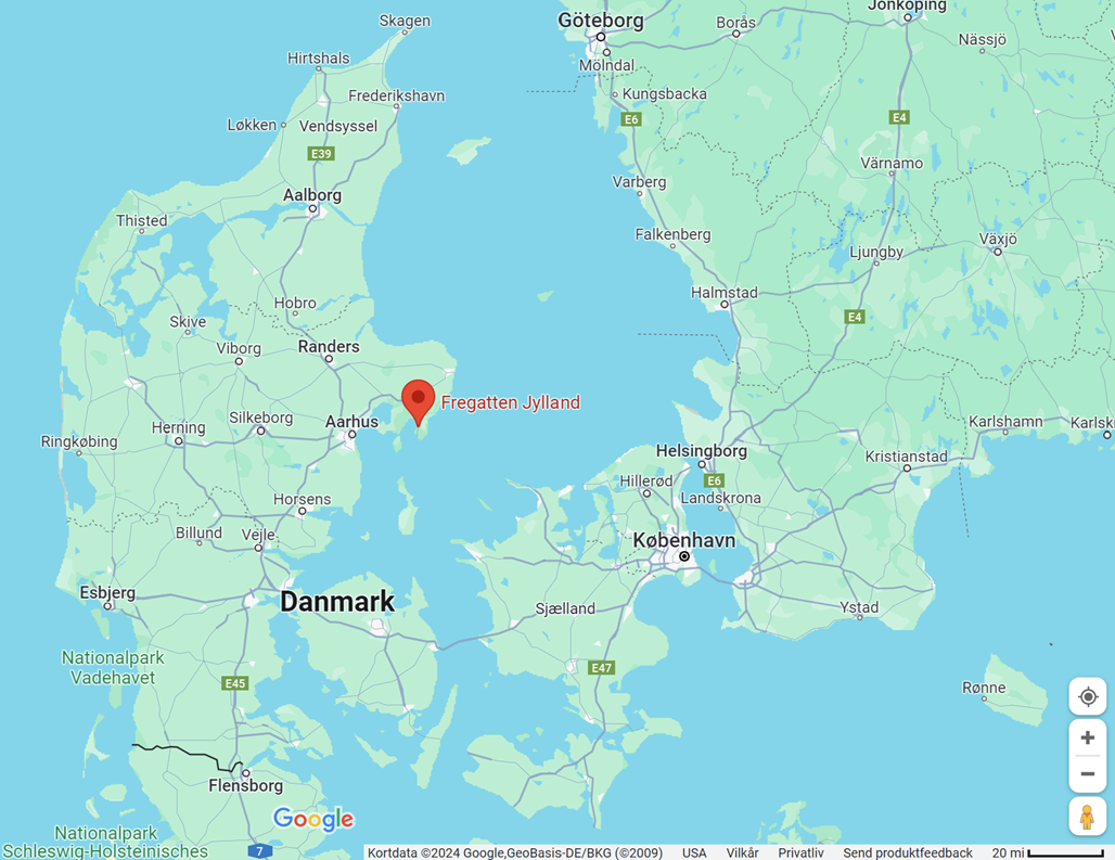 Map of Denmark, from Google Maps, with location of the Jylland museum highlighted. Djursland is the “nose” protruding from the Jutland peninsula. Copenhagen (København) has the best flight connections, with Billund and Aarhus also having a selection of European routes.
