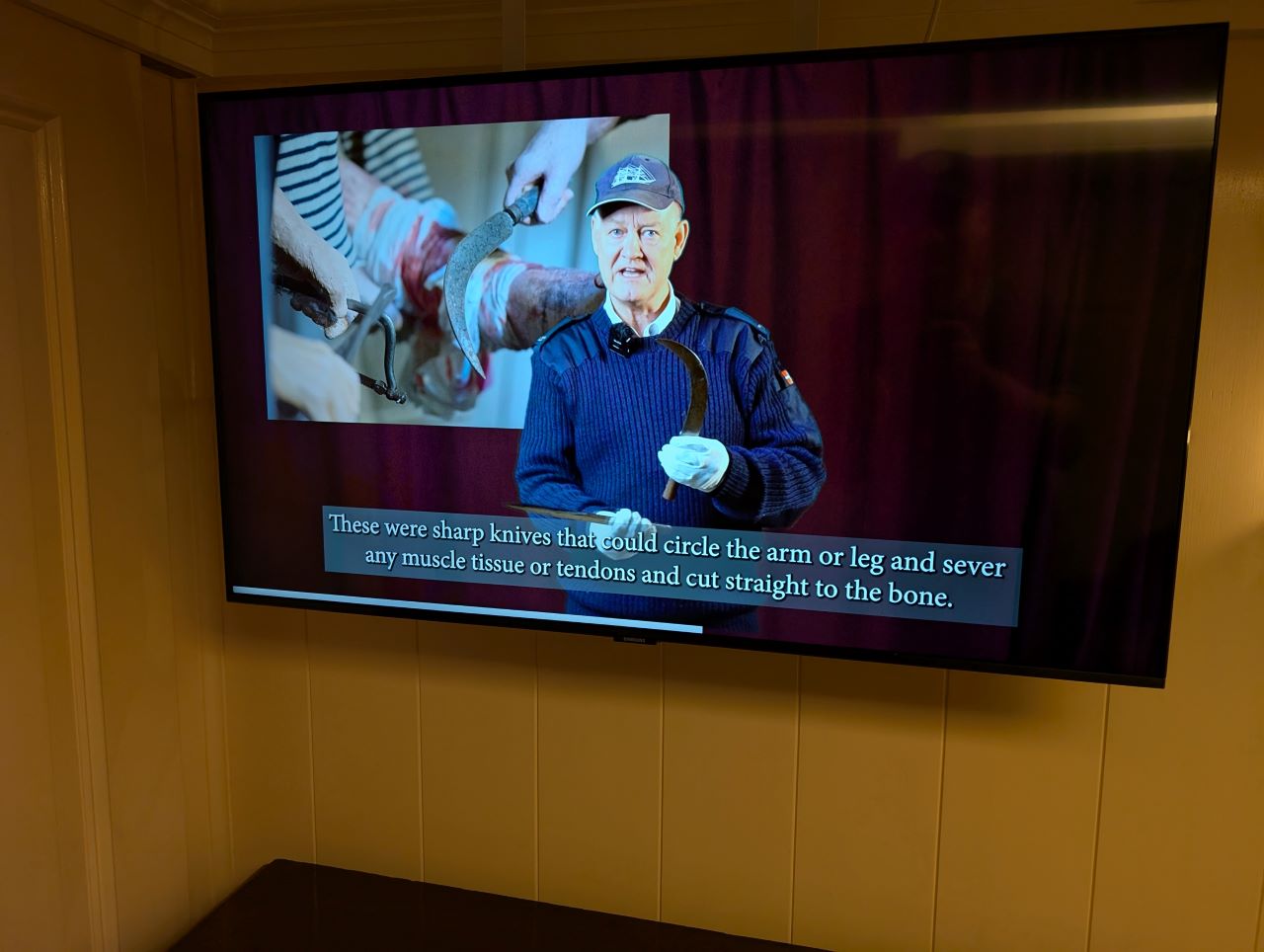 Inside Jylland, there are various full-scale recreations around the ship with key pieces of equipment and mannequins to give an idea of life aboard the ship. E.g. there’s a gun crew “in action”, another set of crewmembers having a meal, there’s a doctor doing an amputation, etc. A large part of the officer’s quarters are furnished as per the period when the ship was used as a royal yacht, i.e. with chairs and tables for the royal family of the time.