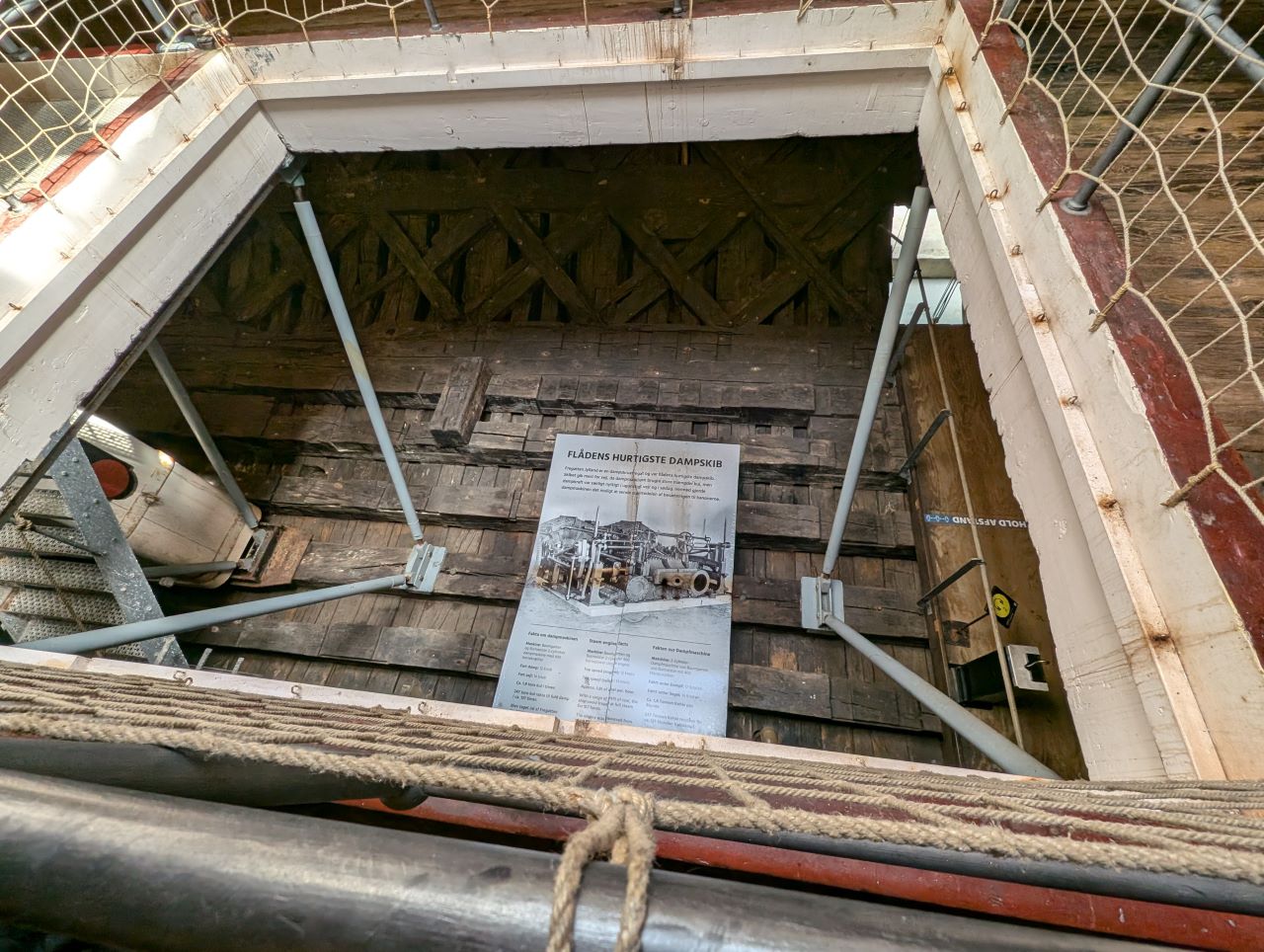 Where the steam engine should’ve been. With a whoppin’ 400 hp, the Jylland steam plant had less power than many modern cars. Note the diagonal bracing structure on the inside of the hull. The grey steel rods are modern additions (as is the hole in the hull, in case anybody’s wondering).
