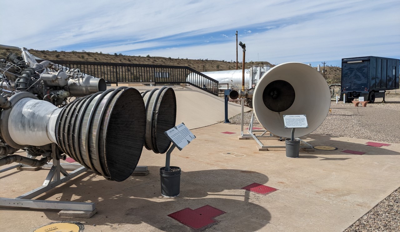 From the launch control center, you head across the cableway to the silo itself, where you can look over at the Titan and get a description of the missile's flight and see pictures of RVs coming in during tests. After that, it's back topside for a description of the antennas, and then you're turned loose to look around the above-ground stuff on your own. The silo itself is half-open, and you can look down all the way to the bottom, which you can't see when down below. There's also a bunch of supporting infrastructure, including trailers for the propellants (thoroughly cleaned, one hopes) and the engines from the missile, which are always fun to see.