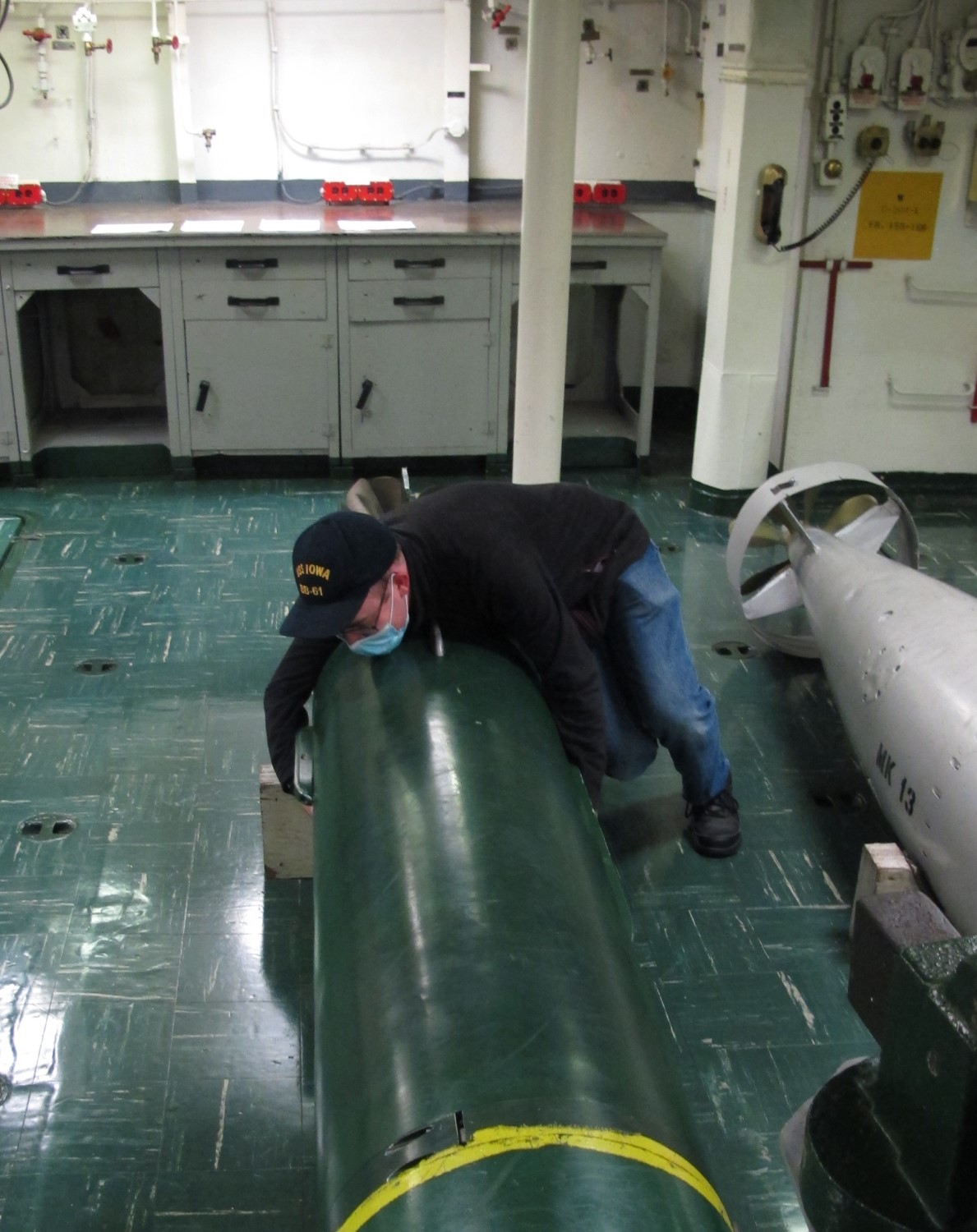 The fight deck appears to be undergoing some sort of work, with only two planes displayed, a T-28 Trojan trainer and an S-3 Viking. Signage was largely absent, but it did give us a chance to talk about flight ops and even about the guns, both 5"/38 and 3"/50, visible below the edge of the deck, including an explanation of the proximity fuze. The lower deck was much better. The various spaces were dressed well, looking like they were reasonably lived in, and covered a nice variety from enlisted berthing to the chapel, sick bay, and officer's wardroom. There were also exhibits on various topics, although we didn't have time to look at any of them, and several seemed to be closed for renovation. A particular highlight was the torpedo workshop, which was gorgeous and had two torpedoes, one Mk 13 and the other a Mk 45 ASTOR. It didn't make any sense to have there, but I still loved it very much, as you can see from the photo below.
