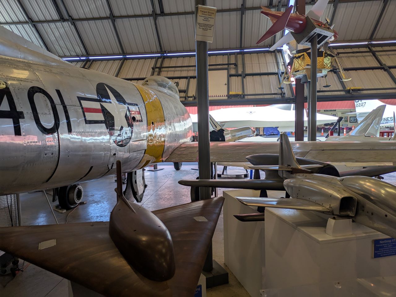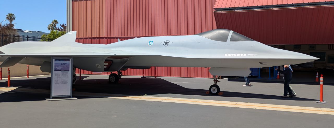 The museum is at the Torrance Airport, which is somewhat irritating to get to, given its distance from the freeways. And while it makes some attempt to chronicle the rich history of airplane production in greater LA, it started as Northrop's house museum, and that very much shows in the planes they have and what part of the story they are most interested in telling. The site is absurdly small, with only five jets on display and not really room for any more: a rather pretty F-86, a two-seat Harrier trainer (which may not be there long, but I'm sure they can find something to replace it), an early A4D-1 Skyhawk, and two Northrop products, an ex-Norwegian F-5 and one of two YF-23 prototypes, the other one of which is at Dayton. (Various places talk about an F-14 and a YF-17, but these appear to be parked elsewhere on the airport.) They did have a fairly large collection of models, engines, and so on to pad the museum out, including an R-4360 that was on Spruce Goose at one point.