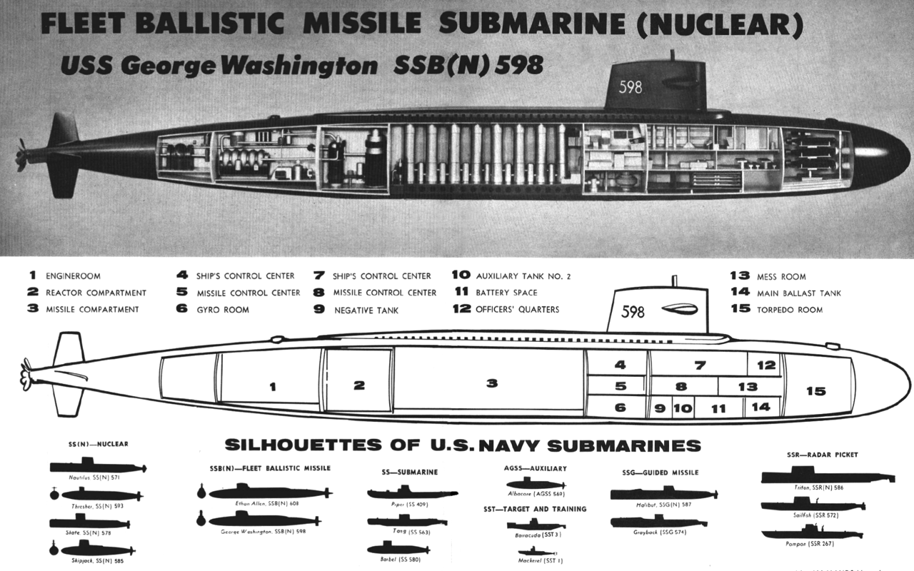 George Washington herself had an interesting history. The Navy's ship designers had begun work on SSBNs while Jupiter was still the primary focus, with the missiles to be incorporated into the sail. Polaris, on the other hand, was short enough to fit into the hull, and each submarine could carry a lot more missiles. The big question was how many, and opinions varied widely, with submarine operators preferring as few as possible (four still sounded good to them, maybe 8 at the outside) and budget analysts wanting as many as they could (32 sounds like a nice number). Eventually, both groups compromised on 16, in two rows aft of the sail, a number designers believed provided the best tradeoff between firepower and the structural demands imposed by 6' cuts in the pressure hull. This configuration also put the missiles squarely at the submarine's center of gravity and reduced any trim problems that might arise from firing a missile, and gave a good path for the beams of light used to align the missile's guidance systems.