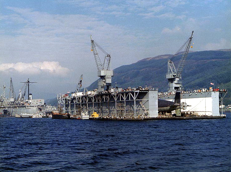 Floating drydock Los Alamos and submarine tender Simon Lake at Holy Loch