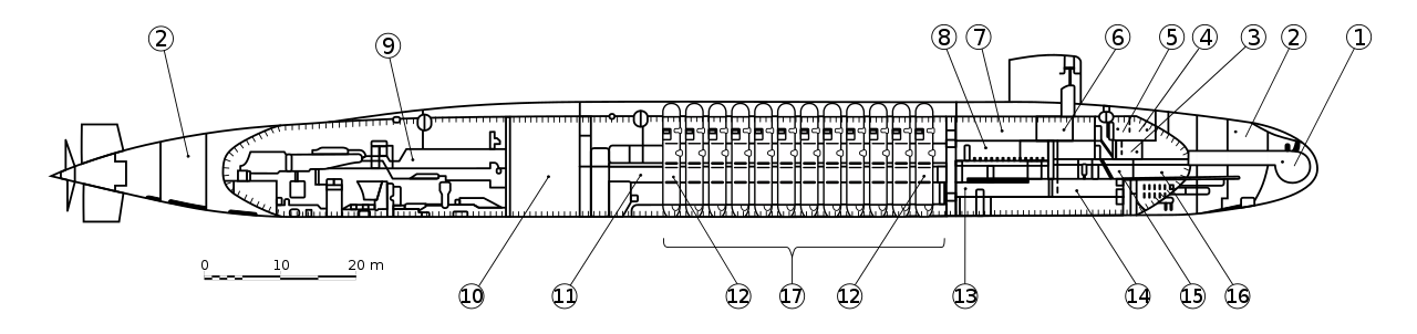 A cutaway of Ohio in SSBN configuration. (1) Sonar dome, (2) Main ballast tanks, (3) Computer room, (4) Integrated radio room, (5) Sonar room, (6) Command and control center, (7) Navigation center, (8) Missile control center, (9) Engine room, (10) Reactor compartment, (11) Auxiliary machinery room no. 2, (12) Crew's berthing (13) Auxiliary machinery room no. 1, (14) Torpedo room, (15) Wardroom, (16) Chief petty officer quarters, (17) Missile compartment