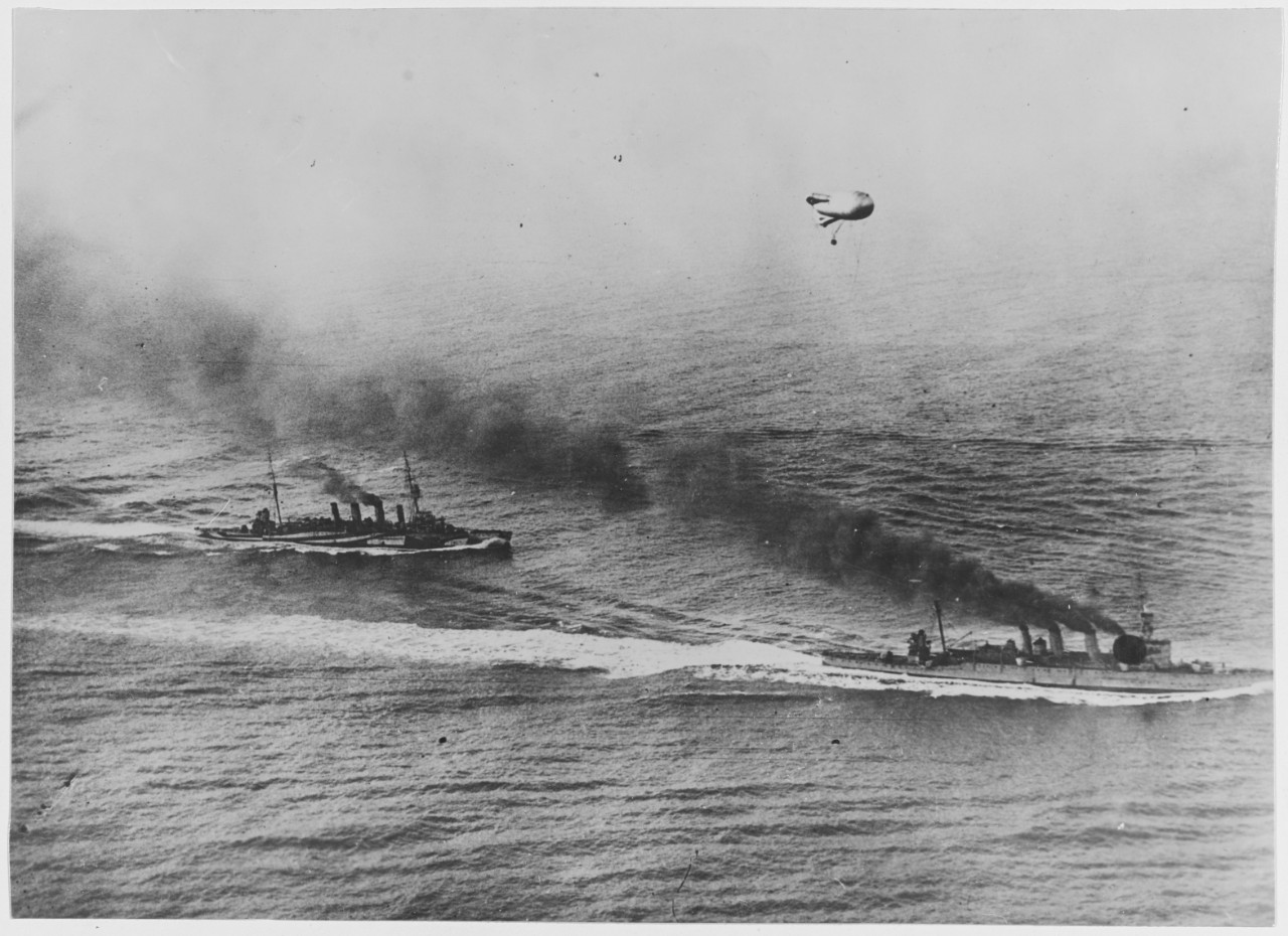 A kite balloon is towed by British ships