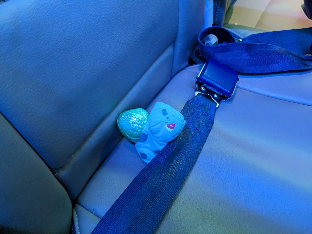 Bulbasaur got his own seat for the last leg of the flight, which was so empty they had to spread passengers out.