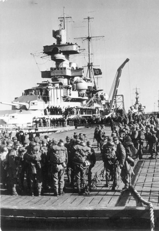 Loading of the assault troops began on April 6th, when troops from the 3rd Mountain Division began to board the vessels that would take them to Narvik and Trondheim. This unit had been part of the Austrian army before the Anschluss, and few of the men had ever even seen the sea, much less been aboard a ship. Now, one regiment would be crammed aboard the ten destroyers of Group I, bound for Narvik, while the other would be carried to Trondheim by Group II, the heavy cruiser Admiral Hipper and four destroyers. Battleships Scharnhorst and Gneisenau would provided heavy cover against a British intervention. Unsurprisingly, the warships made poor transports when asked to carry troops equivalent to two-thirds of their regular crew, as well as all of their equipment. As much ammunition as possible was crammed into the magazines, with the leftovers going wherever there was space, and the larger equipment was lashed down on deck. The troops were told to keep below deck while within sight of land or while under attack to avoid giving the plan away, while crews remained at their stations because there wasn't room for them in the living quarters.