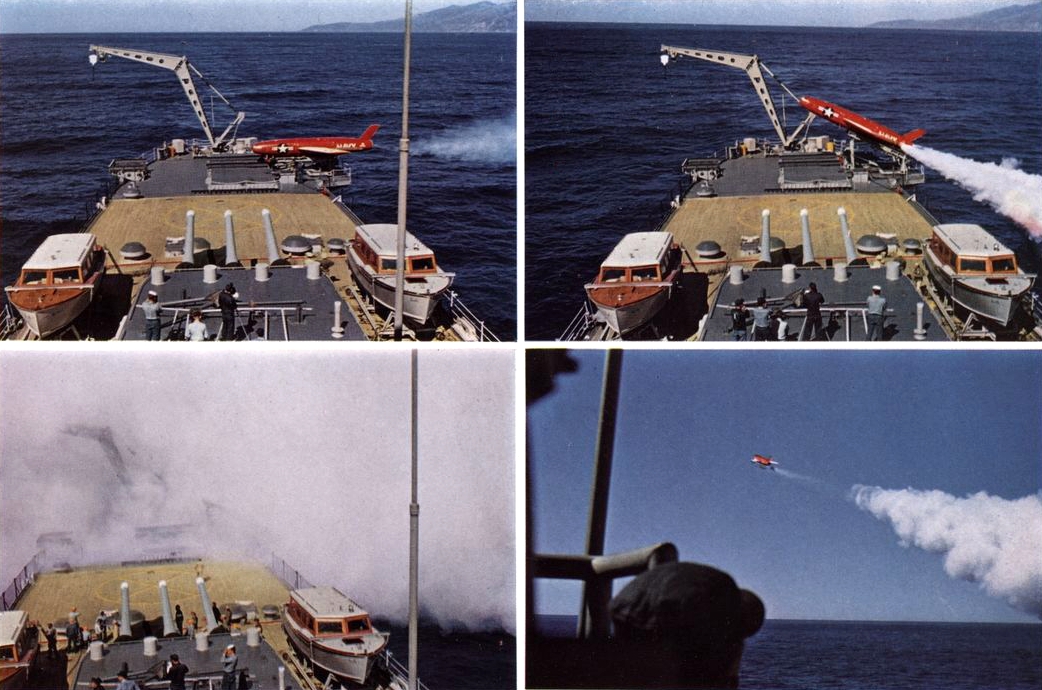 While Regulus was designed for use from submarines, the Navy realized that it could look at other launch platforms, and both carriers and cruisers were investigated. The first tests were conducted in late 1952 from the test ship Norton Sound and the carrier Princeton, and both were successful. The new missile wasn't particularly popular with naval aviation, who saw it as infringing on the manned nuclear delivery roles, but the cruiser force welcomed it as a way of getting long-range striking power onto their ships. Acceptance aboard carriers was also complicated by the mess it made of deck operations. The rocket launch system tended to block up the deck, and the carrier had to bring with it a detachment of aircraft to guide the missile in flight.3 After the carrier Hancock almost lost a launcher, missile and all, over the side during a sharp turn, Vought developed a cart that allowed Regulus to be launched by a carrier's catapult instead, which at least made the situation slightly better. Despite this, Regulus made only a handful of carrier deployments in 1955-56 before being removed in favor of the A4D Skyhawk.