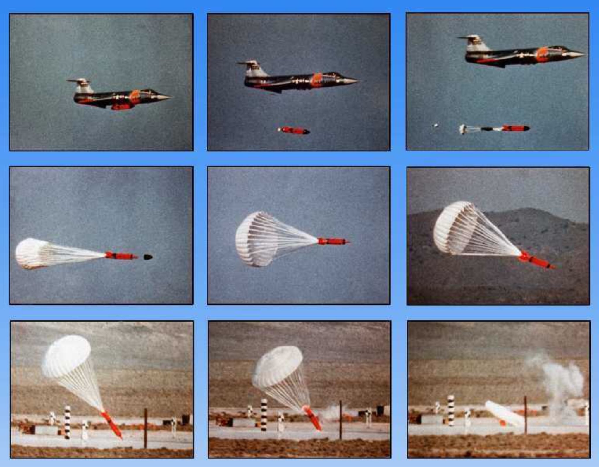 The laydown sequence of a B43 bomb. Note the nose cover being jettisoned, exposing the spike.