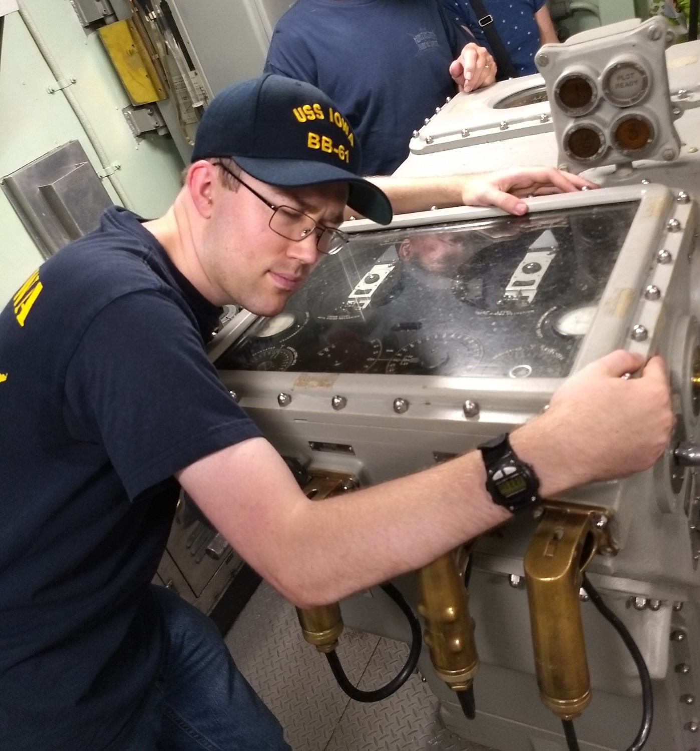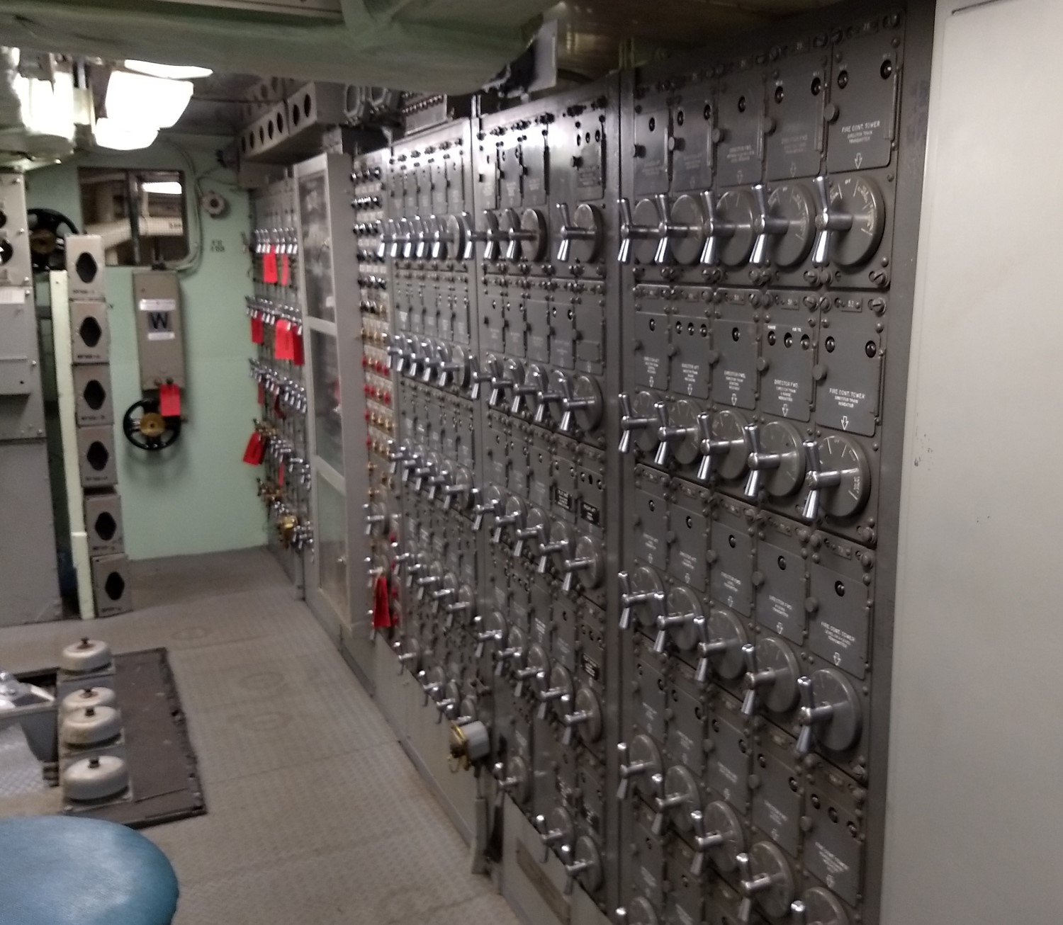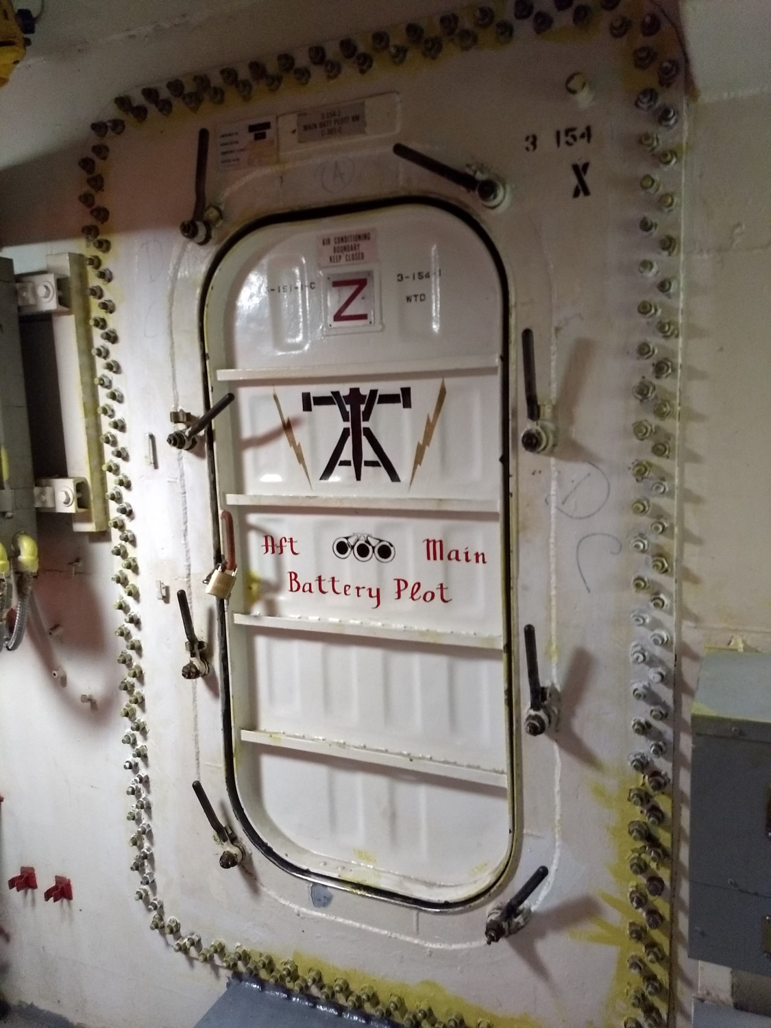 Entrance to the main battery plot is through this door. Note the bolts around it, which allow this section of wall to be opened up for moving large pieces of equipment in and out. Iowa's ops team recently did this to install the Mk 48 shore bombardment computer.