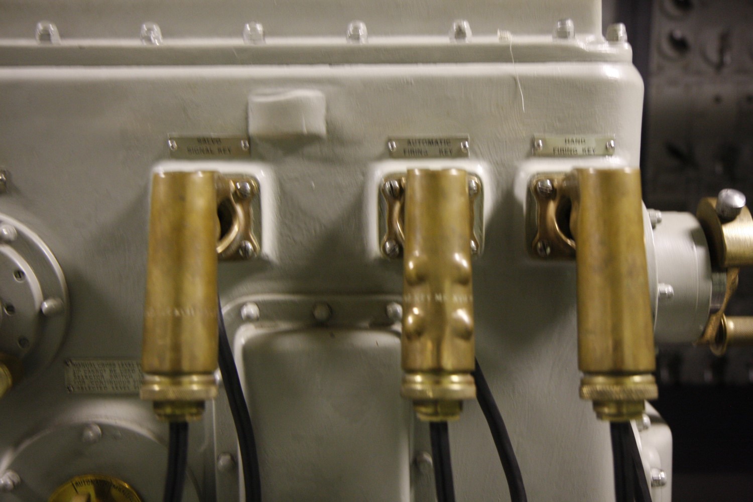 The firing triggers on the stable vertical. The left trigger is pulled to warn everyone that a salvo is about to be on its way, while the right ones actually fire. If in manual mode, the guns fire immediately, while in automatic, the circuit is completed when the guns are in the right position as the ship rolls and pitches. Note that the grips are differently-shaped, so you can tell them apart by touch.