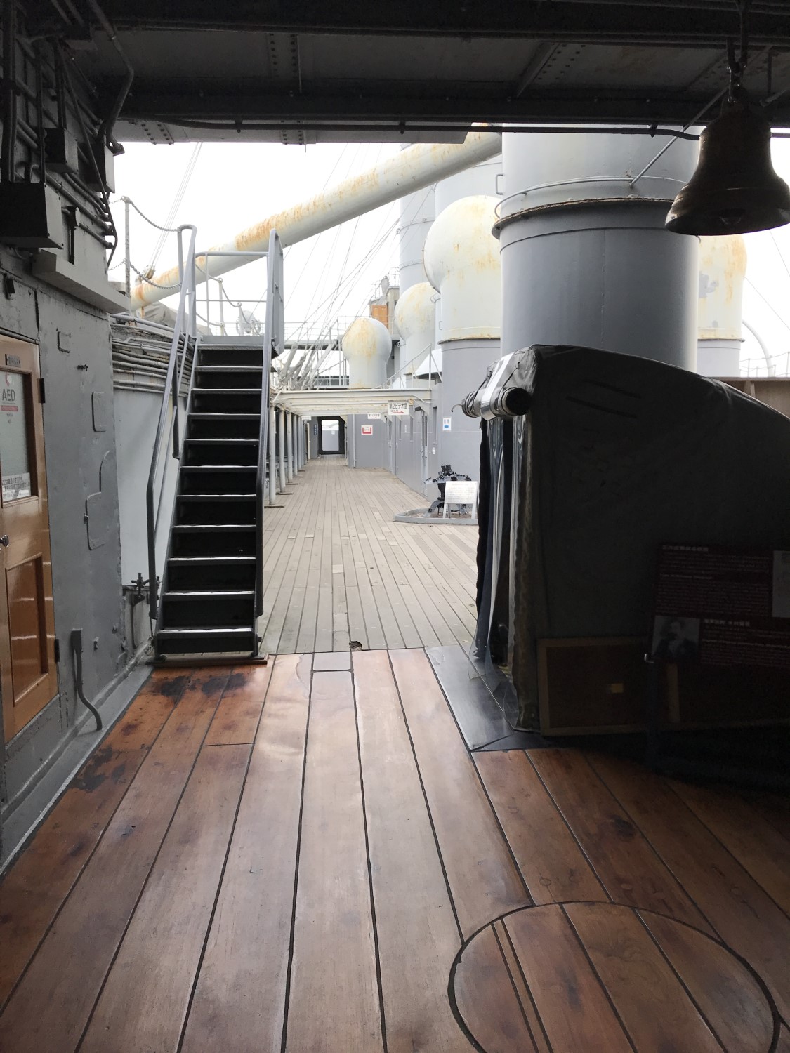 A view aft along the center of the ship. You can clearly see the air intakes for the boilers, as well as the davits for the ship's boats.