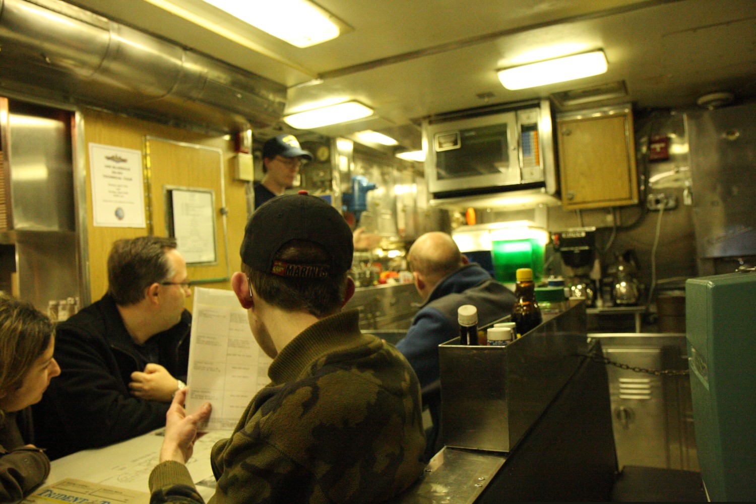 The wardroom, with our guide, who I remember was pretty good, talking to the tour group.
