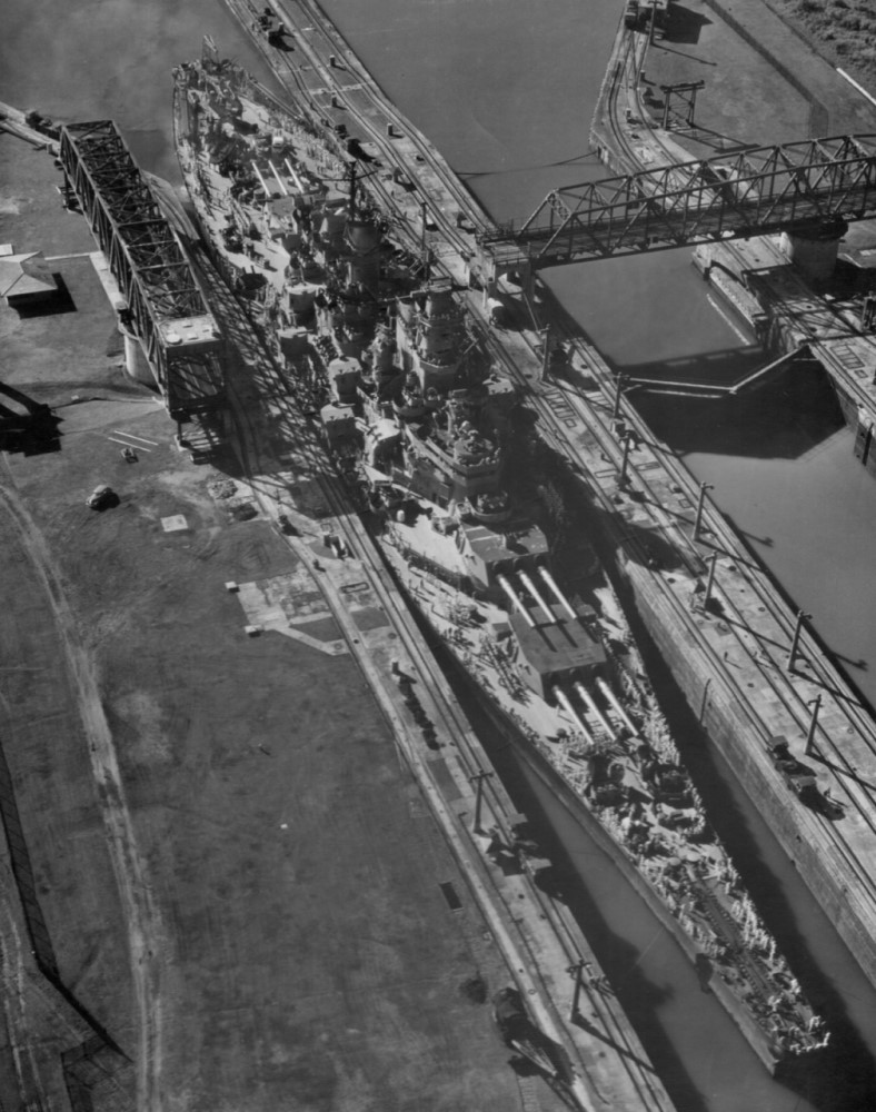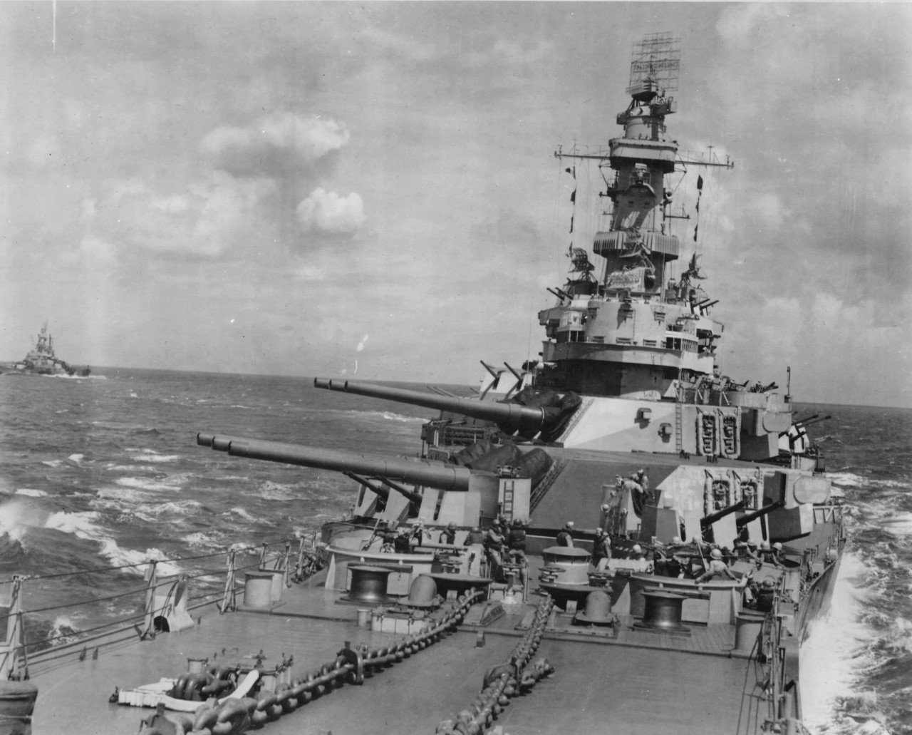 Iowa early in her career, showing the exposed conning tower and secondary conning position halfway up the fire-control tower