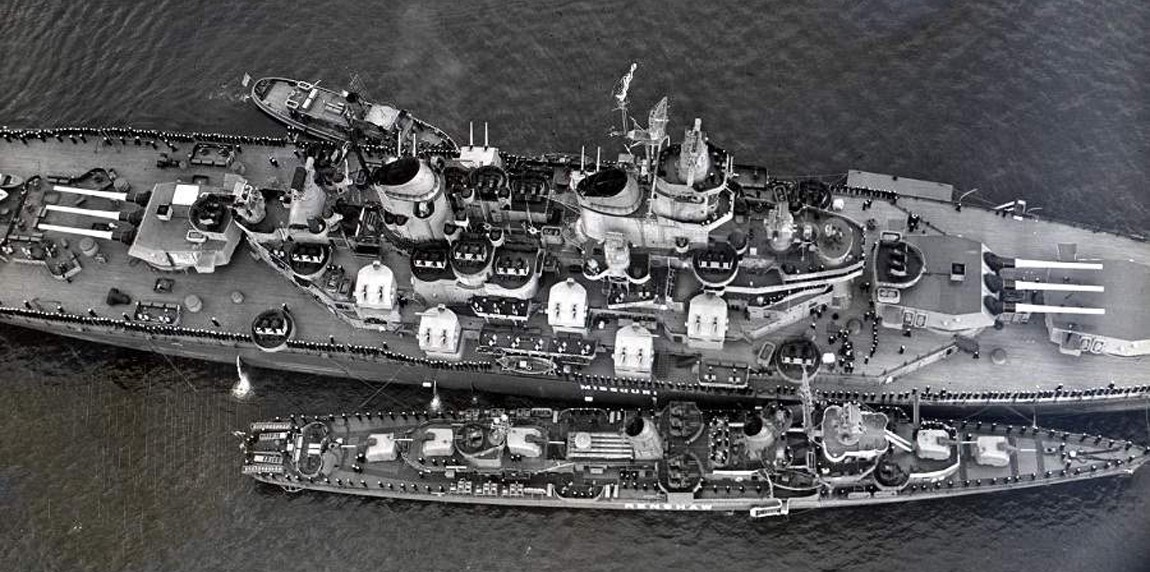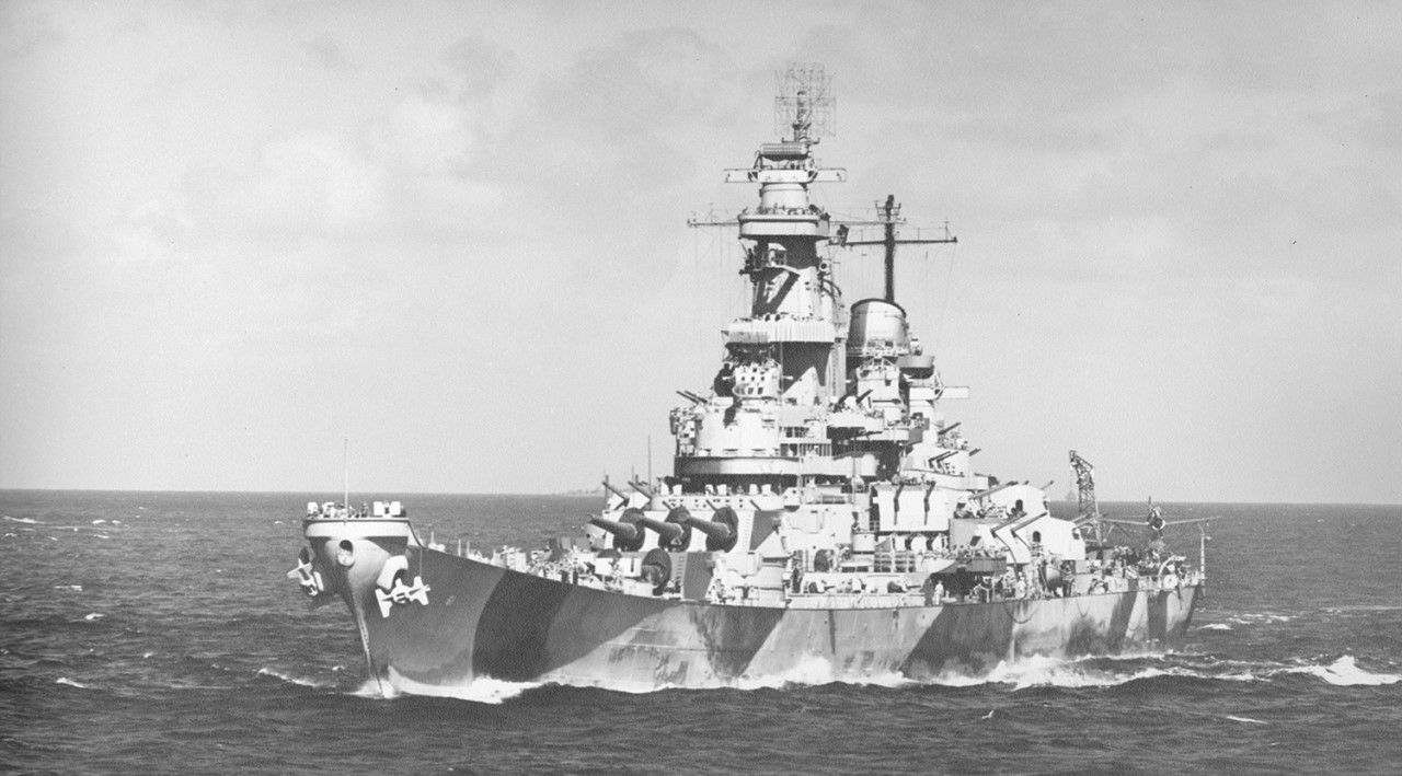 Missouri shows most of her AA guns, although two Bofors are out of sight both fore and aft, along with Oerlikons