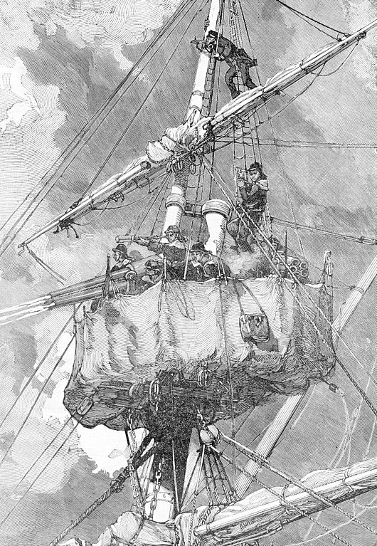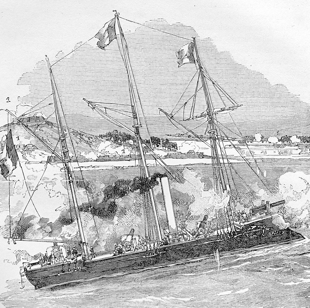A Hotchkiss revolver cannon on the masthead of the gunboat Pluvier engages the enemy at Nam Dinh