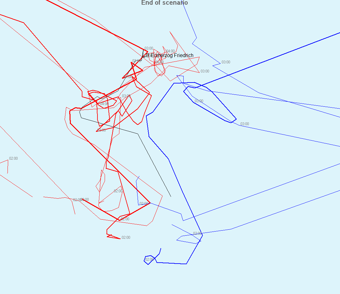 The Austrians find another one of our convoys, this one in the central Mediterranean, in the darkness. This promises to be a messy situation, as their destroyers are almost mixed in with the convoy. Our battleships manage to break free from their destroyers and find their two battleships, then set about trying to engage them. Rudder damage forces one to circle, and we pounce, pouring shellfire into it. It finally is brought to a halt, and torpedoed three times before it sinks. Dawn breaks, and we find the convoy stalked by destroyers, who quickly scatter.
