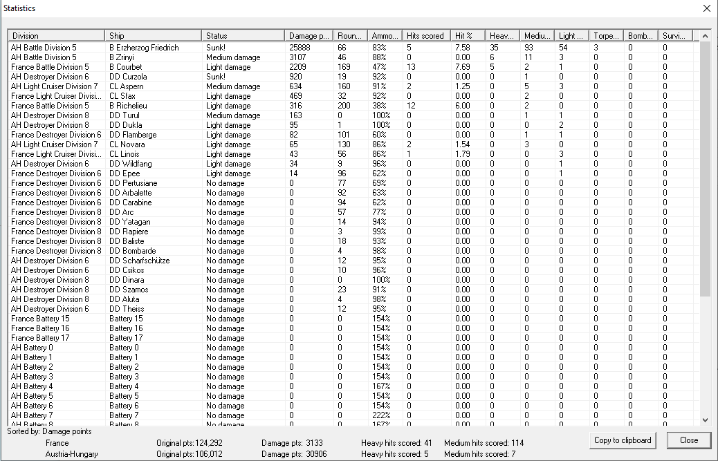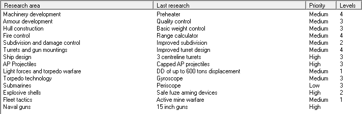 10 ships sunk by raiders. Research priorities are changed to emphasize shells, ship design. AH is building several coastal batteries. Italy now has 13" guns. The rest of the messages were lost when I had to reload the game to clear an error.