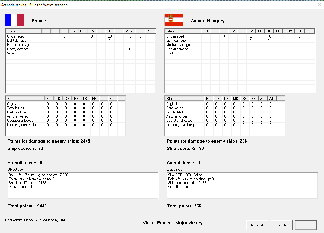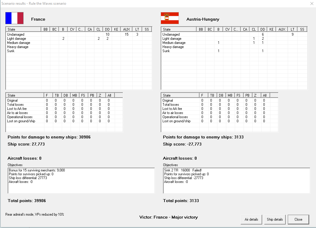 One of the ships in the convoy was heavily damaged, but they all survived, giving us a major victory. +1 Prestige, 1371 VP for us, 52 for them.