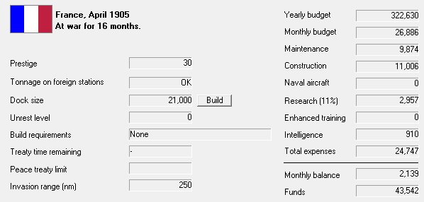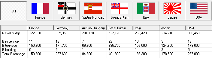 Enemy dominates the seas around Senegal, Middle Congo, -80 VP. 15" gun (-1 quality) researched. 5 ships sunk by raiders. AH is building a coastal battery. UK laid down a BB, and apparently all-big-gun ships will be known as "irresistibles" in this universe. Italy lays down a CL. Japan increase naval budget, orders a CA from an Austrian yard. AH commissions AMC, 3 KE. UK commissions KE, US a DD. 210 VP for blockade of the enemy.