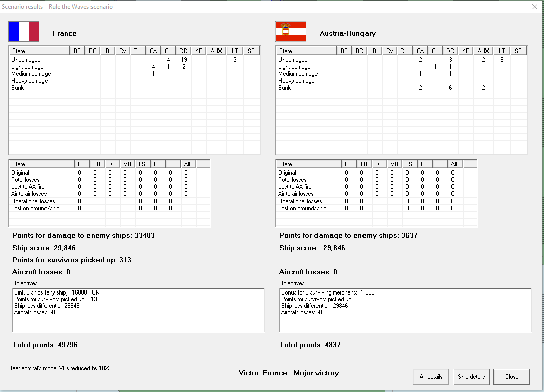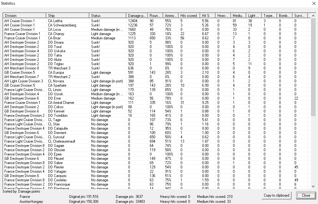 The final toll? We suffered no more than medium damage to a couple ships, while they lost two CAs, six DDs and 2 merchant ships. The Second Battle of Sibenik was a major victory, +1 Prestige. 3190 VP for us, 425 for them.