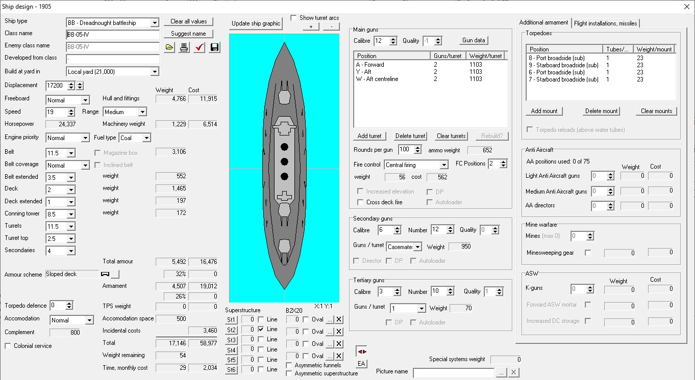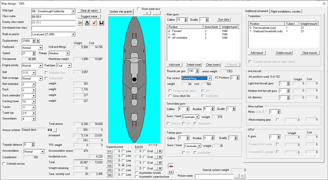 At a cost in secondary armament and secondary armor, BB-05-I has been redesigned with 15" guns