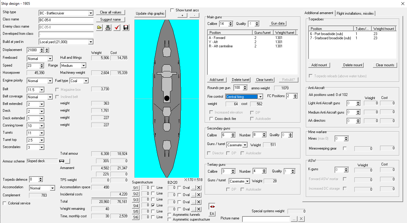 I quite like BC-05-II. I know we're already building battlecruisers, where as we are behind in battleships, but II seems pretty competitive with the battleships, especially if we're okay sticking with 14" guns. On those lines, maybe we should cut investment into larger guns, since 15" was a respectable armament until the end of the battleship era (though I suppose that might be partly due to arms control treaties that we can't count on). Would that risk leaving us behind in gun quality? I've not got much of a preference about the destroyers, but III sounds appealingly efficient. Should we be thinking about bigger docks again?