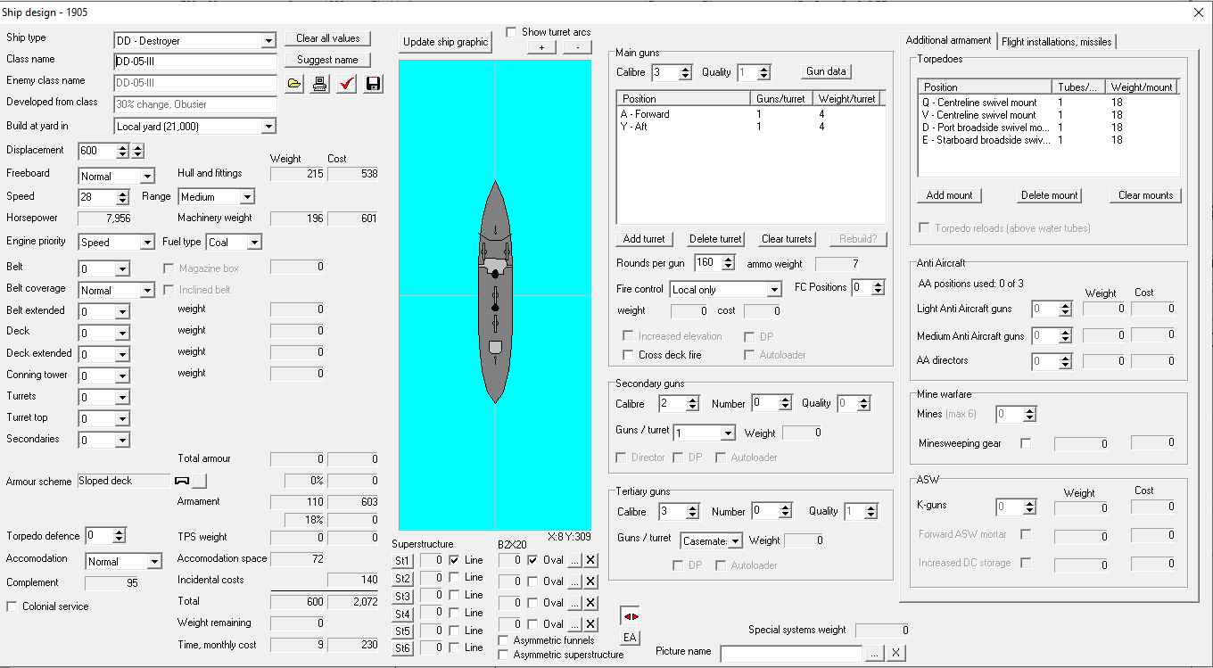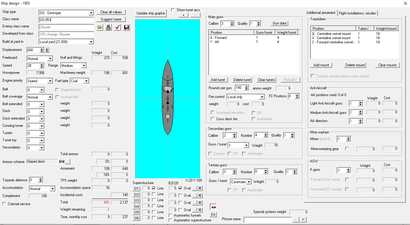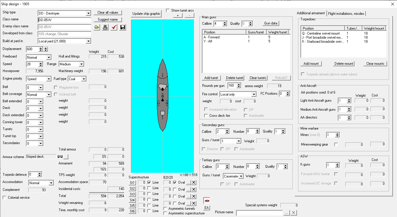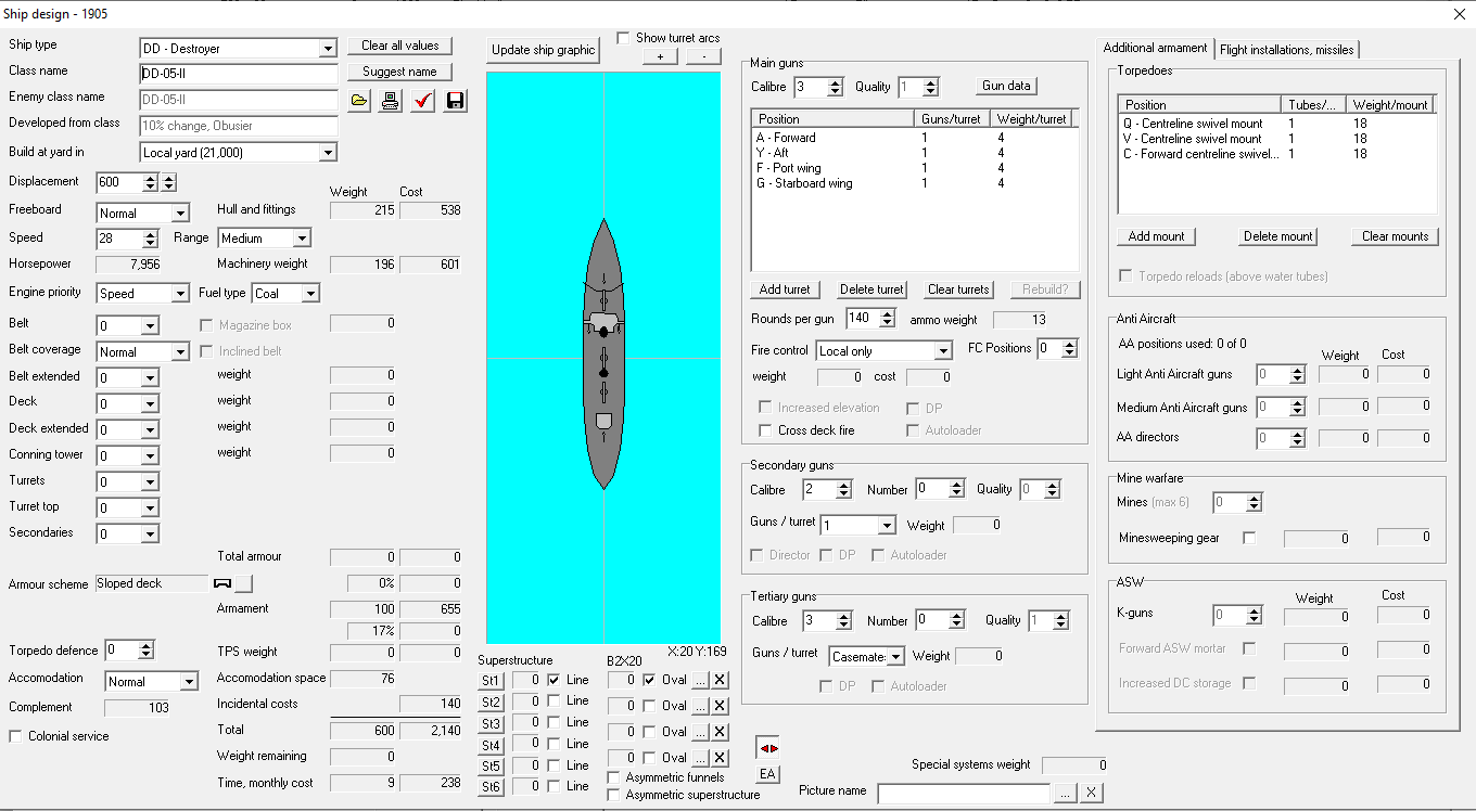 The secondary guns of our battle fleet have been working exceptionally well of late, while torpedoes haven't been a big deal in this war, except for finishing off crippled ships. "We don't need more destroyers right now" would be a very reasonable attitude to have based on experience to date. But I was fiddling with new designs, and came up with a bunch that all work reasonably well.