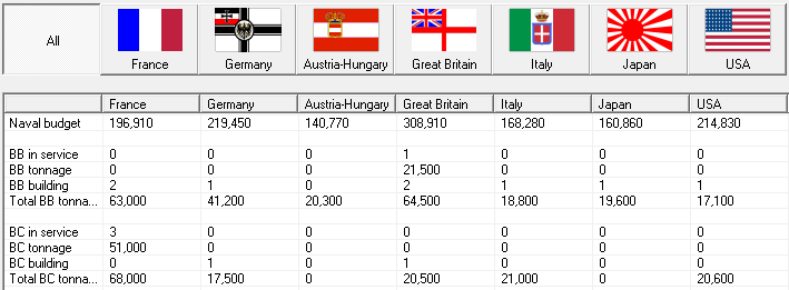 B Ocean finishes her reconstruction, ensuring that all battleships, battlecruisers and large heavy cruisers have the latest fire control. Our spies steal plans for Italian BC Lepanto. An agent of ours is caught in Japan, and we make him a national hero. This raises tension, although our budget stays stable again for some reason. Germany lays down a BB. Italy commissions a B, US a BB.