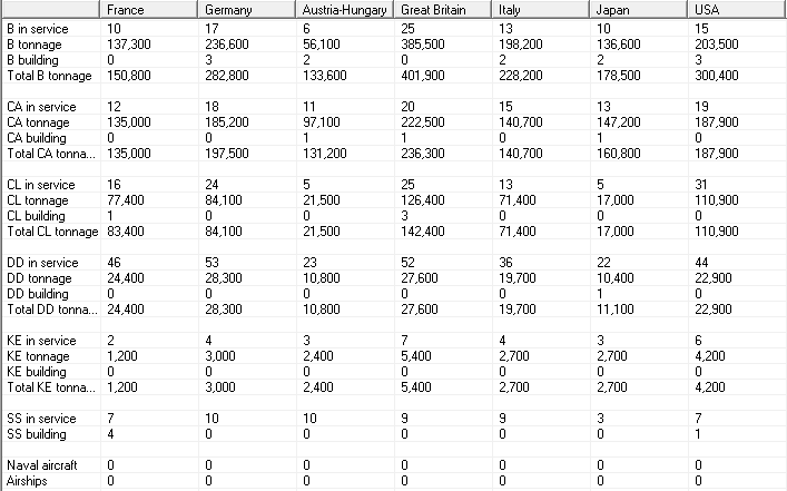 B Ocean begins reconstruction. Breakthrough: 9' rangefinder. UK lays down 3 DD, 1 BB. US lays down 2 DD. Germany, US and A-H each commission 1 B, A-H also commissions 1 CA.