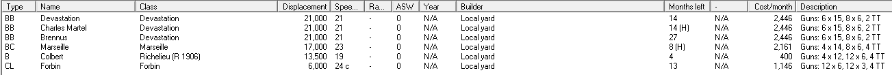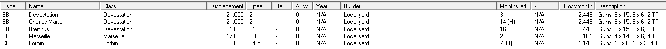 The Marseille is a close cousin of the Duquesne, with an extra .5" of belt and the latest fire control built in from the start. It was a year or so after the first trio, and we'd gotten better tech in the meantime, so I upgraded some. Most naval reference books probably consider it to be Duquesne class, but the game doesn't work that way.