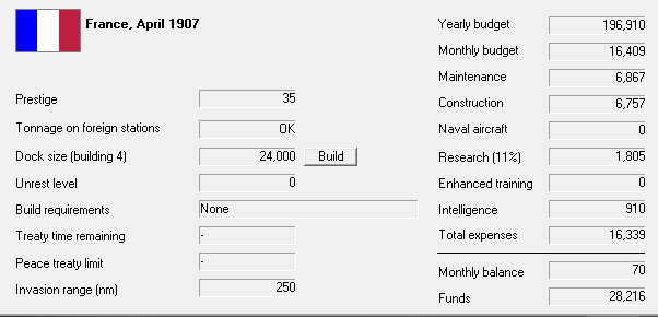 The last year has seen little change in the international situation. Tensions with Germany, Italy and Austria have slowly increased, but there has been no substantial changes. Britain has commissioned two more Irresistibles, and the US has barely beaten us as the second nation to build one. Devastation will commission in July if everything stays on schedule. However, we have two more that will follow the first by a year, while they have no other ships under construction.